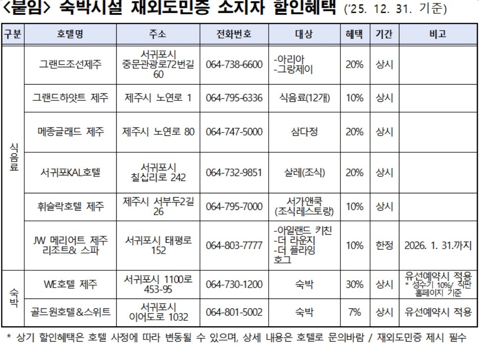 도는 최근 재외도민증 할인 혜택 확대를 위해 도내 숙박업체 참여를 유도하고 있으며, 제주관광협회와 협력해 모집을 이어가고 있다.