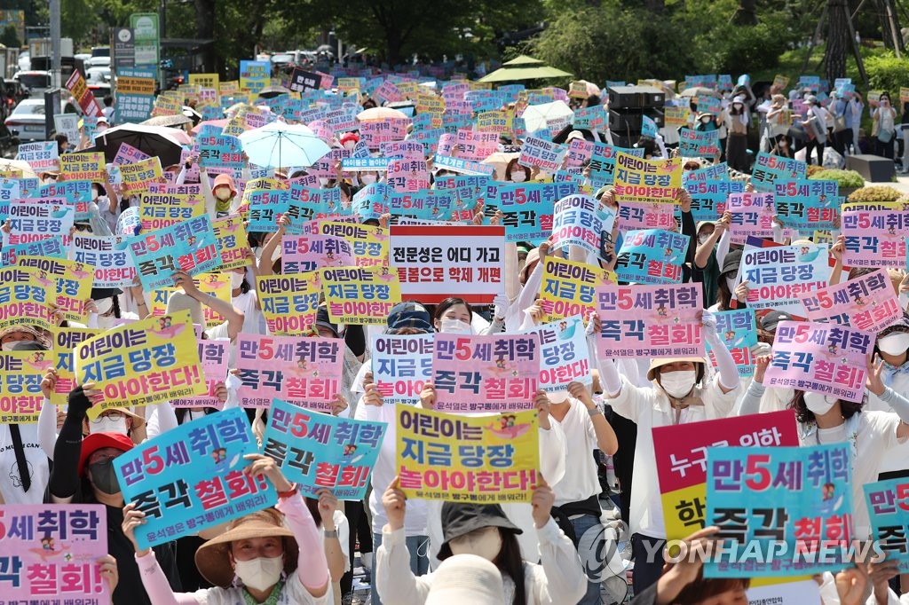 | ▲ Protesters hold banners opposing a government proposal on lowering the school entry age to 5 near the presidential office in Seoul on Aug. 5, 2022. (Yonhap) |