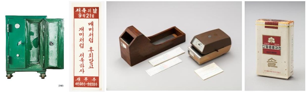 | ▲ 주요 전시품 왼쪽부터 일본의 금고 제작사에서 출시한 금고, 1970년대 재무부에서 저축을 장려하기 위해 발행한 표어, 증권시장에서 사용됐던 호가표와 호가표 접수기, 1980년대 한국산업은행의 산업금융채권 광고가 실린 담배 모습 [대한민국역사박물관 제공. 재판매 및 DB 금지] |