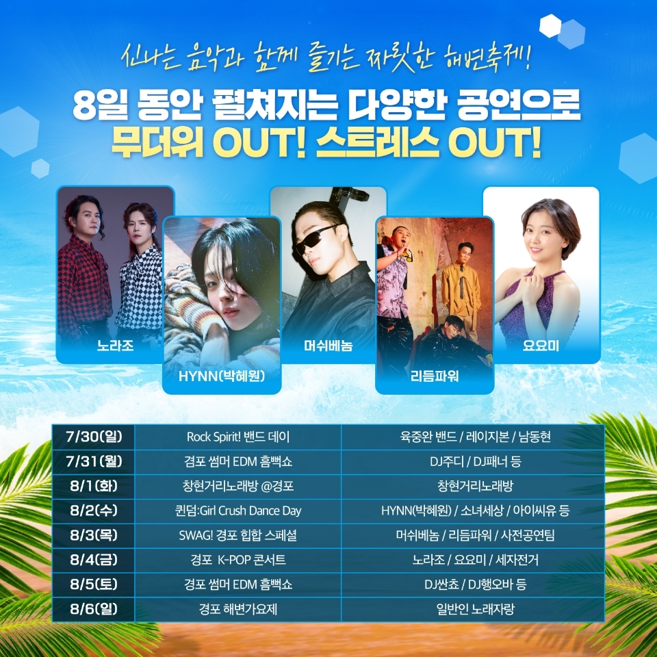 30일 록밴드 데이에는 육중완 밴드와 레이지본, 8월 2일 디바데이에는 박혜원(HYNN), 8월 3일 힙합 공연에는 머쉬베놈, 리듬파워. 8월 4일 K-POP 콘서트에는 노라조와 요요미 등이 무대를 가득 채운다.