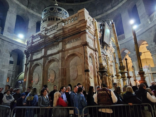 | ▲ 예수의 무덤 (예루살렘=연합뉴스) 양정우 기자 = 지난 2일(현지시간) 찾은 이스라엘 동예루살렘의 예수 무덤교회 내부 모습. 건물 안에 동굴형태로 보존된 예수 무덤을 보기 위해 많은 순례객이 줄을 서 있다. 2022.12.5 eddie@yna.co.kr (끝) |