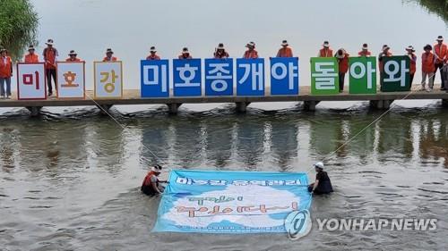 | ▲ "미호강 미호종개야 돌아와" (청주=연합뉴스) 12일 오후 2시 청주 서문대교 아래 무심천에서 사단법인 풀꿈환경재단 관계자들이 '미호강 미호종개야 돌아와'라는 글자의 팻말을 들고 서 있다. 이 단체는 이날 주민참여형 하천관리를 촉구하며 이런 퍼포먼스를 했다고 설명했다. 2023.6.12 [풀꿈환경재단 제공. 재판매 및 DB 금지] vodcast@yna.co.kr |