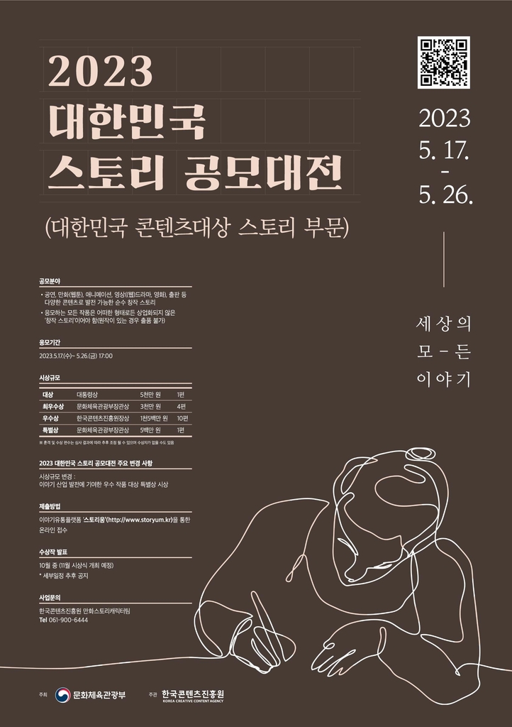 (서울=연합뉴스) 이은정 기자 = ▲ 내달 '2023 대한민국 스토리 공모대전' = 한국콘텐츠진흥원은 다음 달 17일부터 26일까지 '2023 대한민국 스토리 공모대전'을 진행한다고 27일 밝혔다.