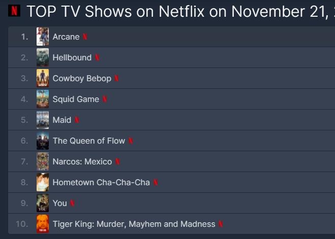 '지옥'을 제치고 1위를 차지한 작품은 순위 집계 전날(20일) 새로운 에피소드가 공개된 미국 애니메이션 '아케인'이다.