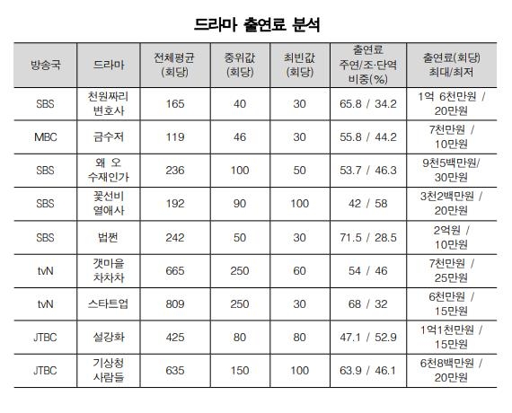 | ▲ 국내 드라마 출연료 분석 표 [이상헌 의원실 제공] |