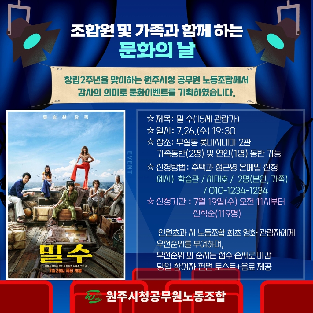 (원주=연합뉴스) 이재현 기자 = 원주시청 공무원노동조합(이하 원공노)은 오는 26일 매달 마지막 주 수요일 '문화가 있는 날'을 맞아 조합원 및 그 가족과 함께 영화 '밀수'를 단체 관람한다고 20일 밝혔다.