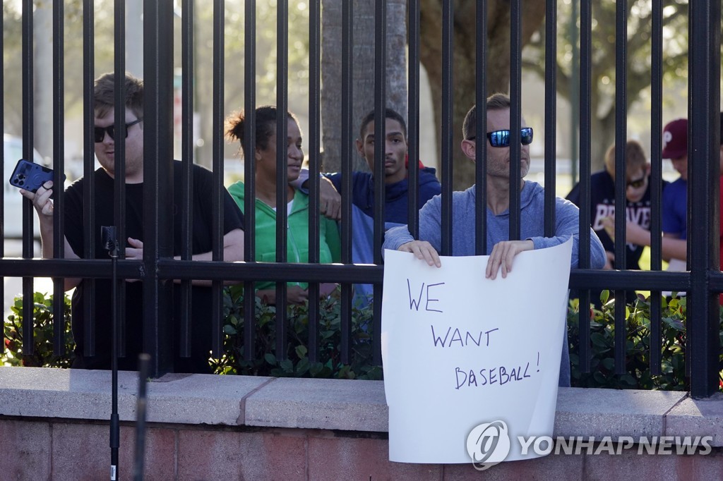| ▲ "우리는 야구를 원한다" (주피터 AP=연합뉴스) 미국 메이저리그 팬들이 2일(한국시간) 미국 플로리다주 주피터의 로저 딘 스타디움 앞에서 항의 메시지를 전하고 있다. |