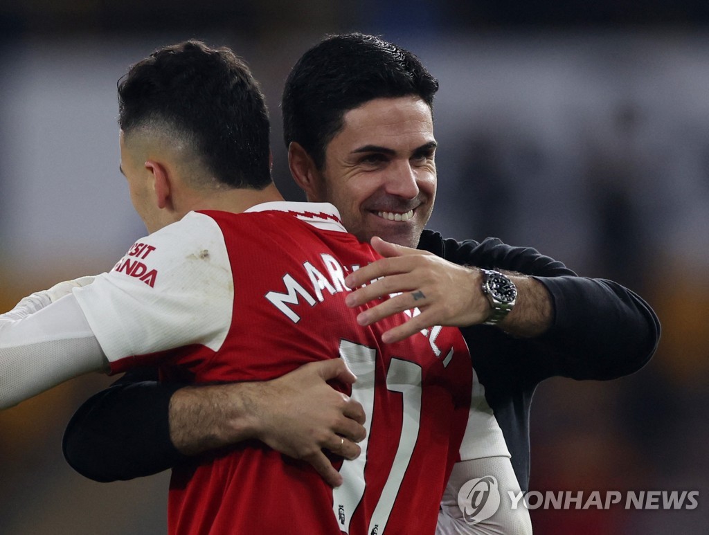 | ▲ 마르티넬리와 포옹하는 아르테타 감독 [로이터=연합뉴스] |