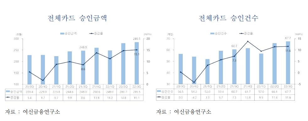 카드 종류별로는 개인카드 승인액이 232조3천억원, 법인카드 승인액이 53조3천억원으로, 각각 작년 3분기 대비 13.6%, 22.0% 증가했다.