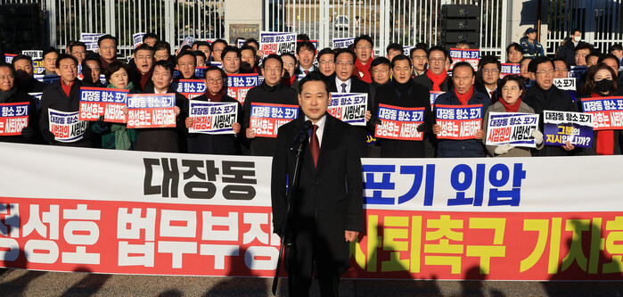 Jang Dong-hyeok, leader of the main opposition People Power Party, speaks as the party's lawmakers stage a protest rally at the government complex in Gwacheon, south of Seoul, on Nov. 18, 2025, to demand Justice Minister Jung Sung-ho step down, as the party alleges the government has pressured the prosecution into not appealing a high-profile development corruption case linked to President Lee Jae Myung from his time as mayor of Seongnam. (Yonhap)