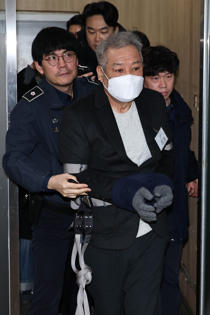 Jeon Seong-bae (front), a jailed shaman and better known as Geonjin, is taken to the office of special counsel Ann Gweon-seob in Seoul on Jan. 19, 2026. (Yonhap)