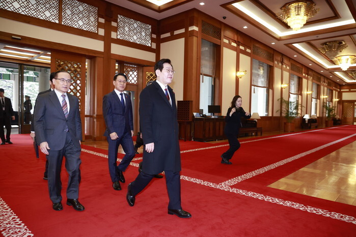 President Lee Jae Myung (R) arrives for work at the presidential office Cheong Wa Dae in Seoul on Dec. 29, 2025, as he begins working at Cheong Wa Dae the same day, with the presidential office officially relocated from the capital's Yongsan Ward after three years and seven months. (Pool photo) (Yonhap)