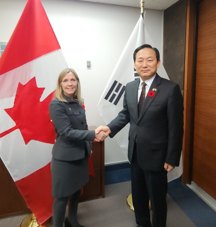 South Korea's Vice Defense Minister Lee Doo-hee (R) and Canadian Deputy Minister Stefanie Beck shake hands prior to their talks in Ottawa on Nov. 5, 2025, in this photo released by the South Korean defense ministry. (PHOTO NOT FOR SALE) (Yonhap)