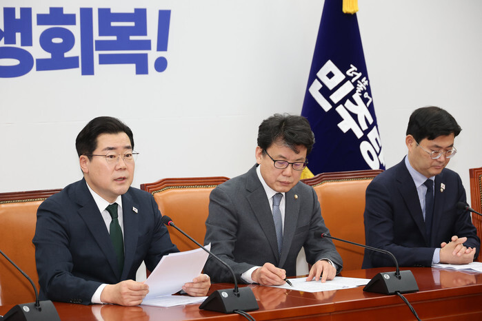 Park Chan-dae (L), floor leader of the main opposition Democratic Party, speaks during a meeting of the party at the National Assembly in Seoul on March 4, 2025. (Yonhap)