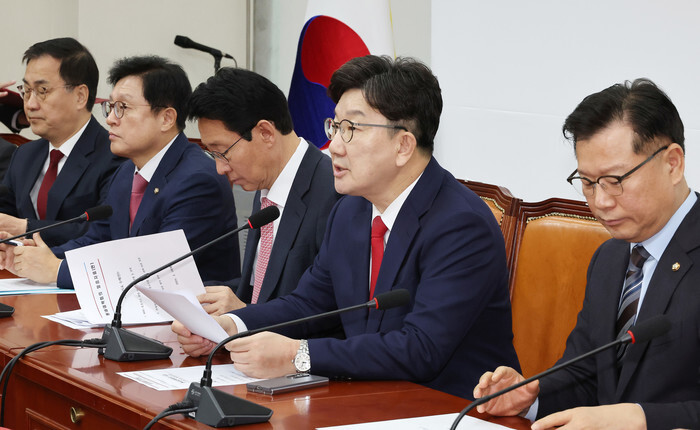 Kweon Seong-dong (4th from L), floor leader of the ruling People Power Party, speaks during a meeting of the party at the National Assembly in Seoul on March 18, 2025. (Yonhap)