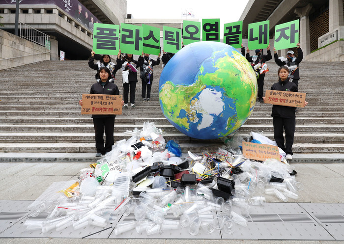 Earth Day Activists rally for the cutback of plastic production at Gwanghwamun Square in Seoul on April 22, 2024, on the occasion of Earth Day. (Yonhap)(END)<저작권자(c) 연합뉴스, 무단 전재-재배포, AI 학습 및 활용 금지>