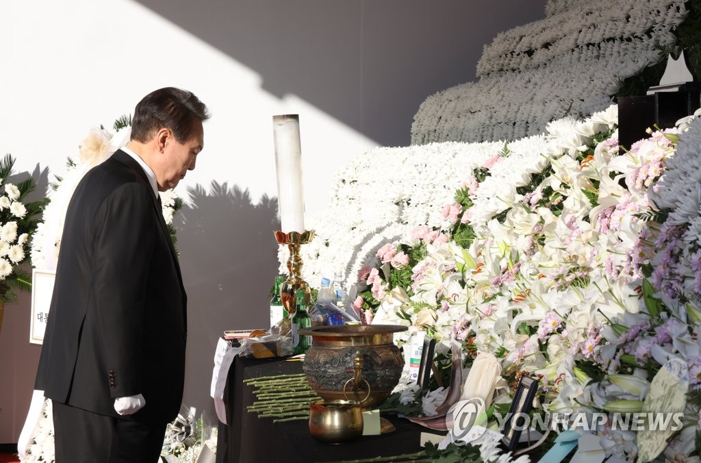 | ▲ President Yoon Suk-yeol bows his head in silent tribute to the victims of the Halloween crowd crush at a mourning altar in front of City Hall in Seoul on Nov. 4, 2022. (Yonhap) |