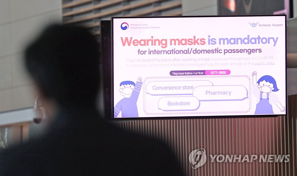 | ▲ A notification asking people to wear masks indoors is shown on a screen inside Incheon International Airport on Dec. 11, 2022. (Yonhap) |