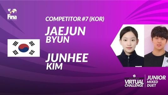 | ▲ 변재준(오른쪽)-김준희가 출전한 주니어 혼성 듀엣 부문 선수 소개 화면. [국제수영연맹 중계영상 캡처. 재판매 및 DB 금지] |