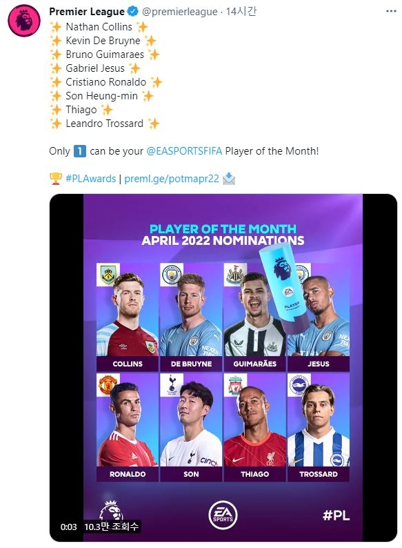 손흥민은 5일(한국시간) EPL 사무국이 발표한 '4월의 선수' 후보 8명에 이름을 올렸다.
