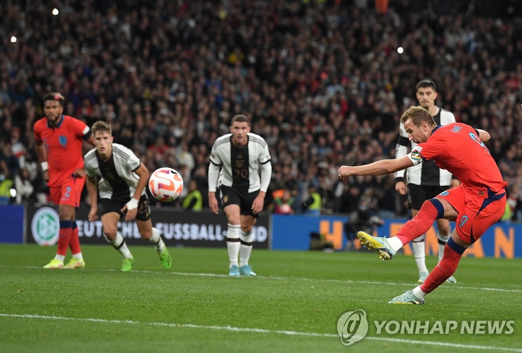 | ▲ 독일전서 PK 성공시키는 잉글랜드…3-3 무승부로 리그 B 강등 (런던 EPA=연합뉴스) 잉글랜드 축구선수 해리 케인(오른쪽)이 26일(현지시간) 영국 런던 웸블리 스타디움에서 열린 유럽축구연맹(UEFA) 네이션스리그(UNL) A 3조 6차전 독일과의 경기 후반 38분 페널티킥으로 득점하고 있다. 잉글랜드는 독일과 3-3 무승부로 경기를 마치며 조별리그 3무 3패로 3조 최하위를 기록, 리그 B 강등이 확정됐다. 2022.9.27 alo95@yna.co.kr |
