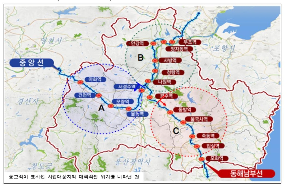 개발 구간을 A(아화역∼서경주역), B(부조역∼경주역), C(동방역∼모화역) 등 3개 구간으로 나눠 각각의 구간에 대해 동시에 공모를 시행한다.