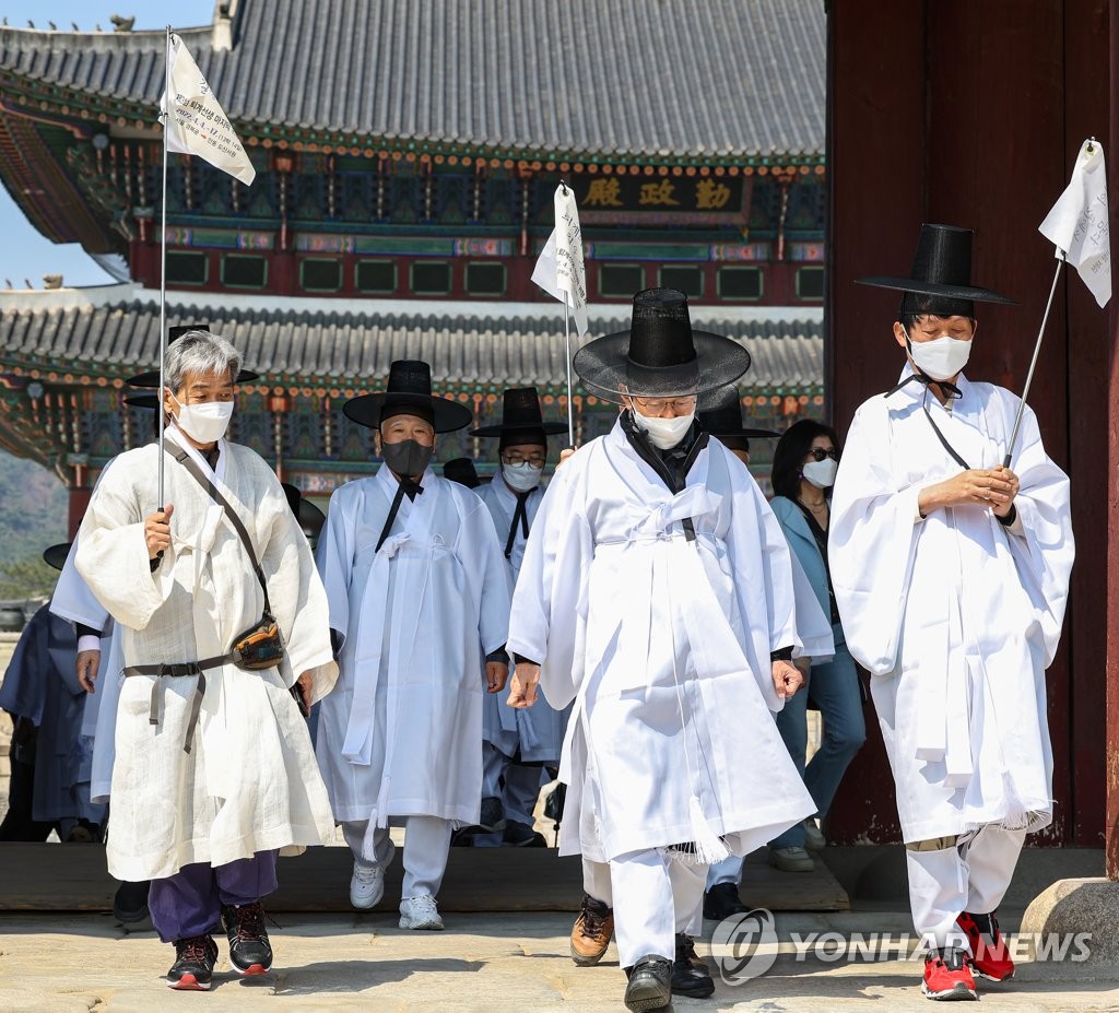| ▲ 퇴계 선생의 귀향길 따라 도산서원으로 향합니다 (서울=연합뉴스) 황광모 기자 = 4일 오후 서울 경복궁 사정전(思政殿) 내 만춘전(萬春殿) 앞에서 열린 제3회 퇴계 선생 귀향길 걷기 '퇴계의 길에서 길을 묻다' 개막식을 마친 참가자들이 도포와 갓을 차려입고 출발해 근정전 앞을 지나고 있다. 도산서원과 도산서원 선비문화수련원이 주최하는 이 행사는 서울 경복궁을 출발해 오는 17일까지 2주간 진행된다. 참가자들은 서울 경복궁에서 경북 안동 도산서원까지 선조 임금의 만류에도 공직에서 물러난 퇴계 선생의 발자취를 따라 700리(276Km)를 걷고, 때로는 뱃길을 이용할 계획이다. 2022.4.4 hkmpooh@yna.co.kr |