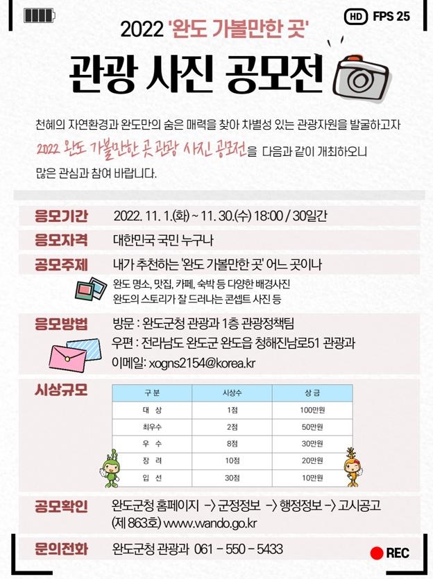 공모전 주제는 완도의 다양한 관광 자원을 소재로 한 '내가 추천하는 완도 가볼 만한 곳'이다.
