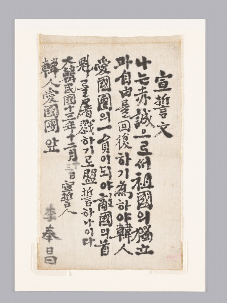 그는 선서문에서 '나는 적성으로써 조국의 독립과 자유를 회복하기 위하야(위하여) 한인애국단의 일원이 되야(돼) 적국의 수괴를 도륙하기로 맹서하나이다'고 썼다.
