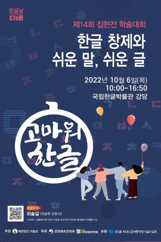 ▲ 외솔회, 한글날 맞아 '한글 창제와 쉬운 말, 쉬운 글' 학술대회 = 재단법인 외솔회는 한글날을 맞아 오는 6일 국립한글박물관 강당에서 '제14회 집현전 학술대회'를 연다.