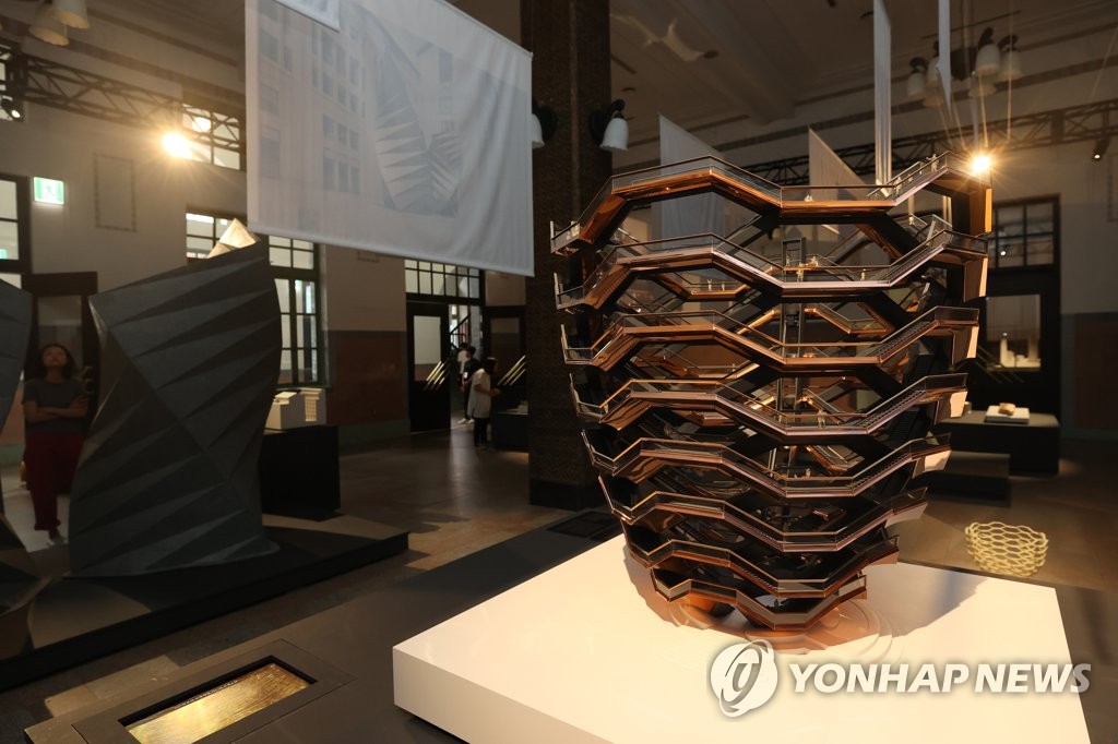 ▲ 서울에서 만나는 뉴욕 랜드마크 (서울=연합뉴스) 강민지 기자 = 28일 오전 서울 중구 문화역 서울 284에서 '헤더윅 스튜디오:감성을 빚다' 전시 간담회 참석자가 뉴욕 '베슬' 프로젝트를 둘러보고 있다. 2023.6.28 mjkang@yna.co.kr