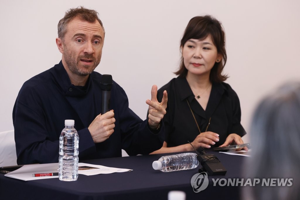 ▲ 인사말하는 토머스 헤더윅 (서울=연합뉴스) 강민지 기자 = 영국의 유명 디자이너 겸 건축가 토머스 헤더윅이 28일 오전 서울 중구 문화역 서울 284에서 열린 '헤더윅 스튜디오:감성을 빚다' 전시 간담회에서 인사말을 하고 있다. 오른쪽은 이지윤 큐레이터. 2023.6.28 mjkang@yna.co.kr