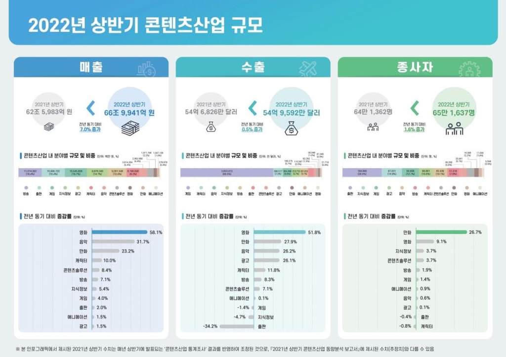 (서울=연합뉴스) 이은정 기자 = 올해 상반기 국내 콘텐츠 산업은 코로나19 팬데믹 영향에서 회복세가 이어지며 매출과 수출액 모두 지난해 동기 대비 증가세를 나타냈다.