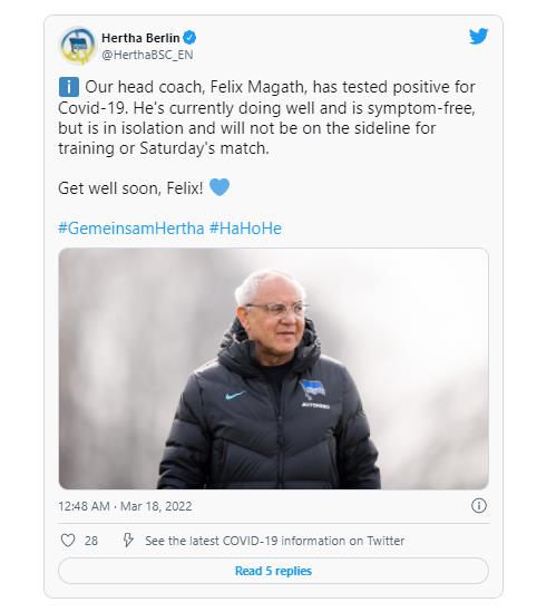 | ▲ 펠릭스 마가트 신임 감독의 코로나19 확진 소식을 전한 헤르타 베를린. [헤르타 베를린 구단 SNS. 재판매 및 DB 금지] |