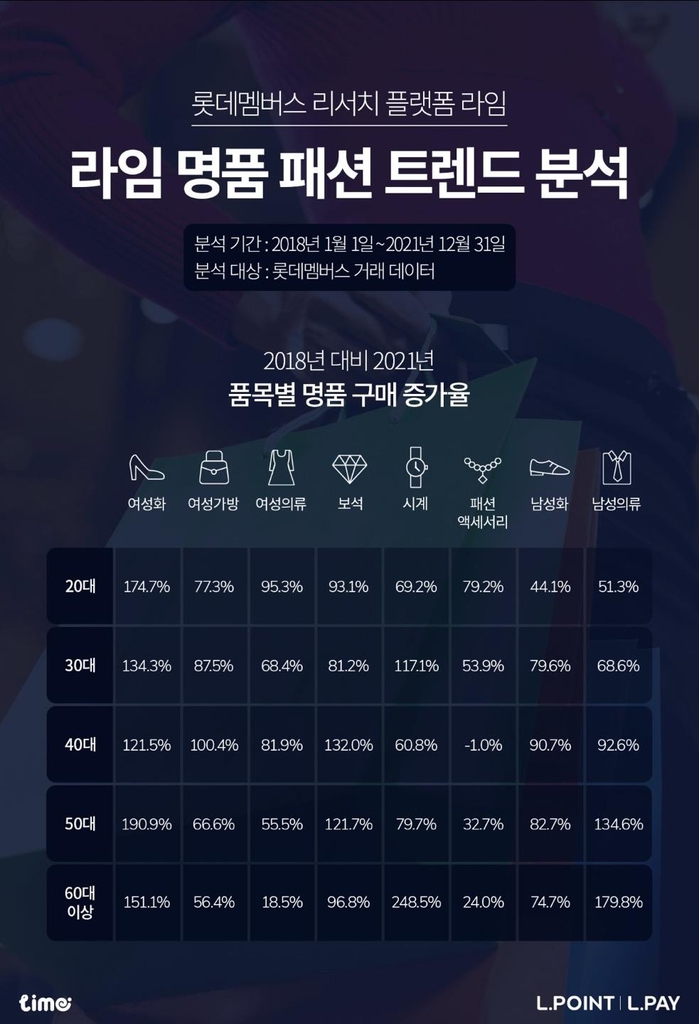 엘페이와 엘포인트 운영사인 롯데멤버스는 22일 거래 데이터를 분석해 발간한 '라임 명품 소비 트렌드 보고서'를 통해 이같이 밝혔다.