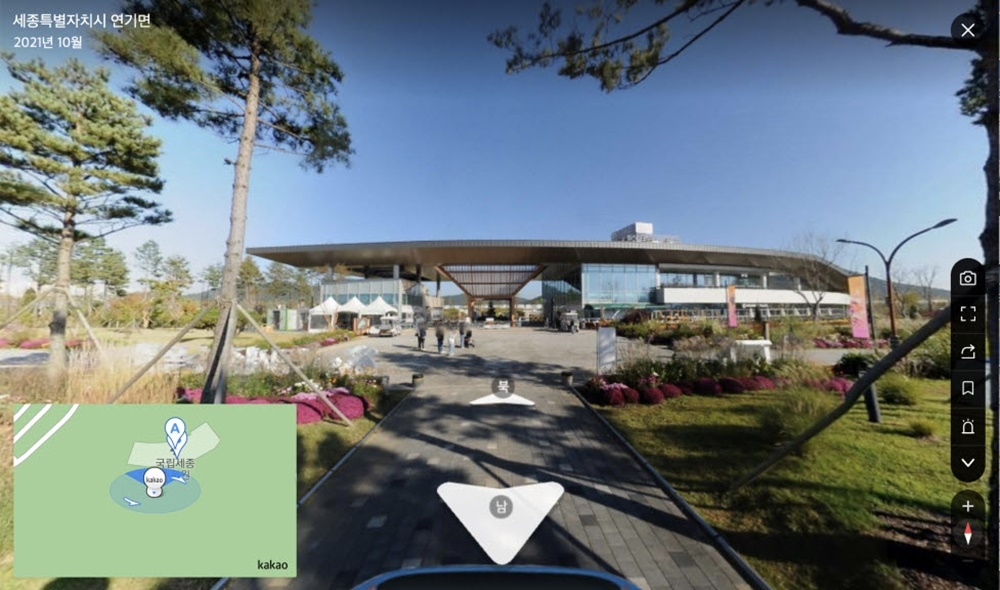 카카오맵에서 '국립세종수목원'을 검색한 뒤 로드뷰 아이콘을 클릭하면 서비스 제공 구간이 파란색으로 활성화하며, 원하는 지점을 클릭하면 비대면으로 수목원을 관람할 수 있다.