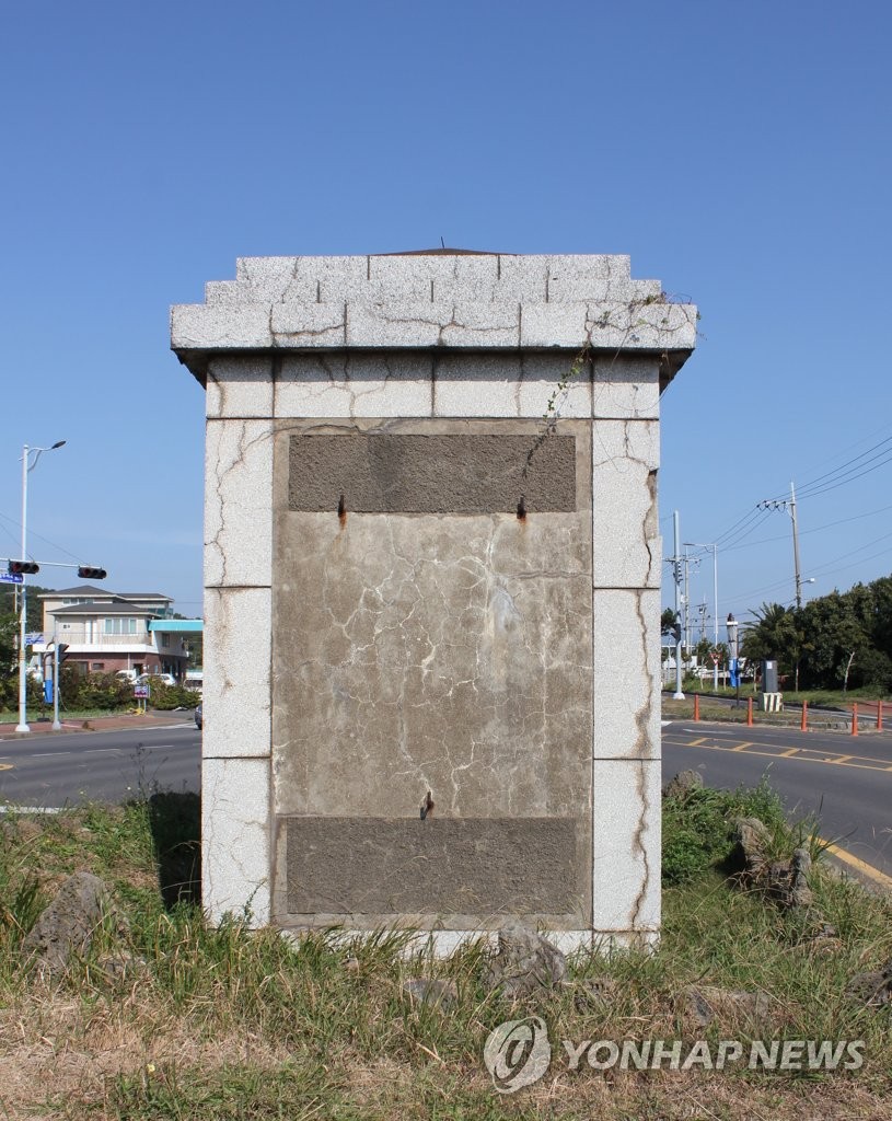 | ▲ 국가 등록문화재 고시 '제주 육군 제1훈련소 정문' (제주=연합뉴스) 한국전쟁 당시 신병 양성의 요람 육군 훈련소의 흔적이 있는 '제주 구 육군 제1훈련소 정문'이 국가 등록문화재로 고시됐다. 사진은 제주 서귀포시 대정읍 상모2리 교차로에 남아 있는 정문 기둥. 2021.11.4 [제주도 제공. 재판매 및 DB 금지] koss@yna.co.kr |
