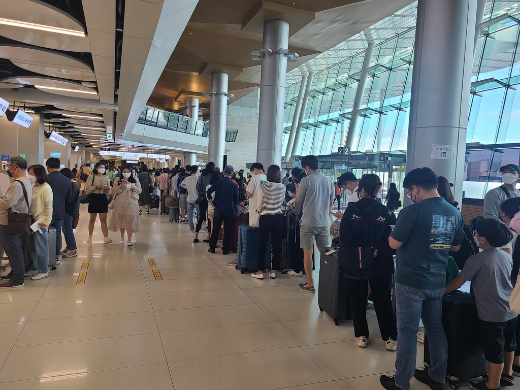 현장에서 안내하던 공항 직원은 "추석 연휴 영향도 있지만, 태풍으로 제주행 항공기가 다수 지연됐다가 8시 30분께부터 풀려 대기 줄이 길어졌다"고 했다.