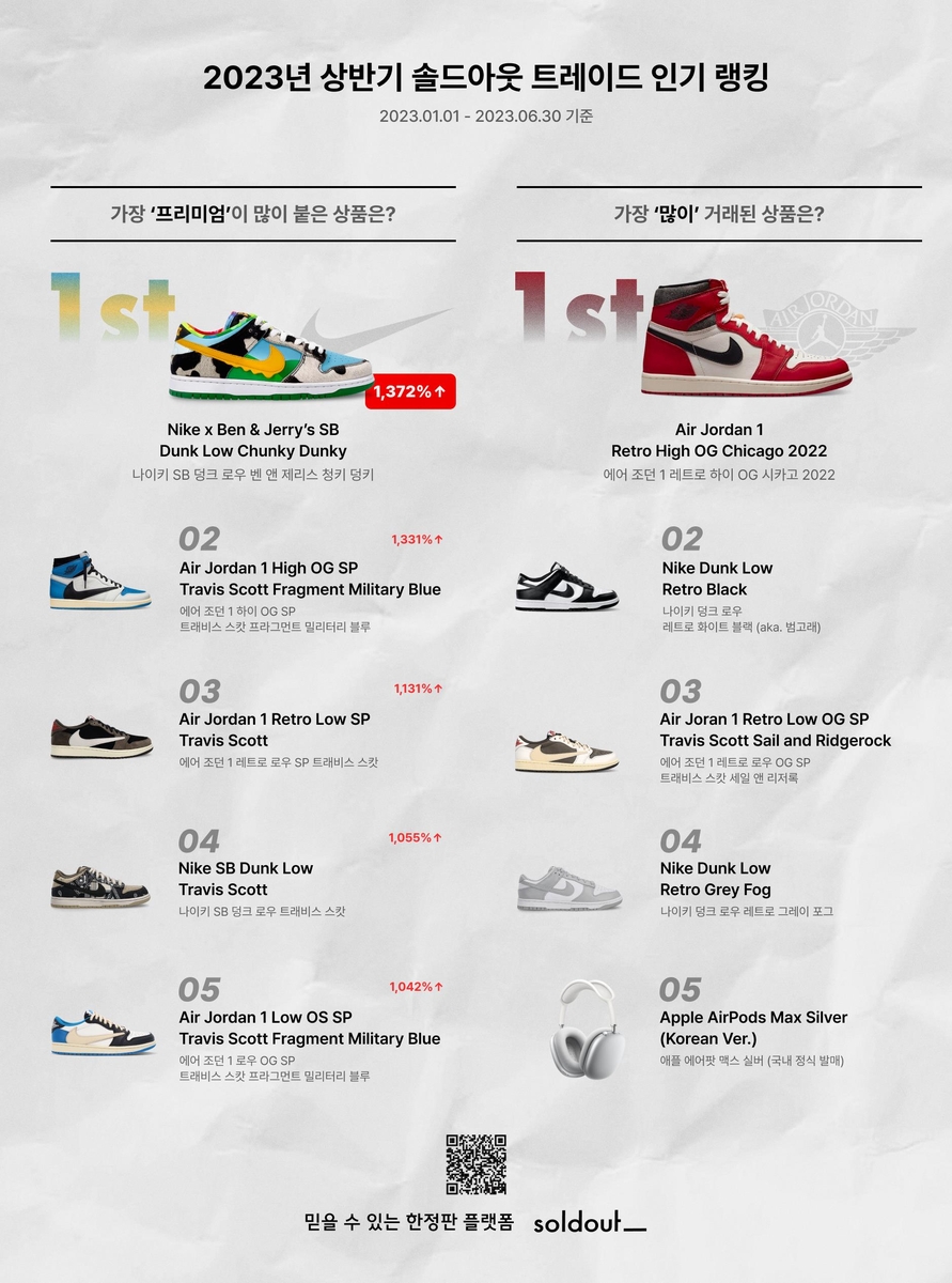 12일 무신사의 한정판 거래 플랫폼 '솔드아웃'에 따르면 상반기 거래된 상품 중 발매가 대비 재판매가가 가장 많이 오른 것은 '나이키 SB 덩크 로우 벤 앤 제리스 청키 덩키'였다.