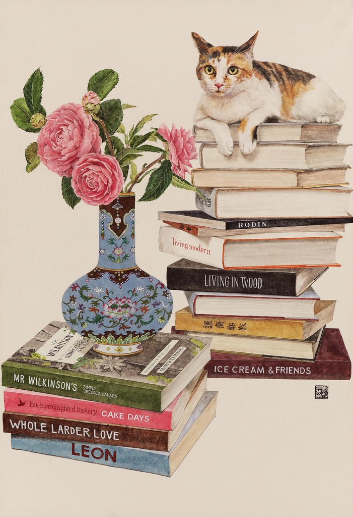 이정은은 책, 꽃과 화병, 과일과 장식품 등 일상의 사물들이 놓인 책가도(冊架圖)를 현대적인 미감으로 그린다.
