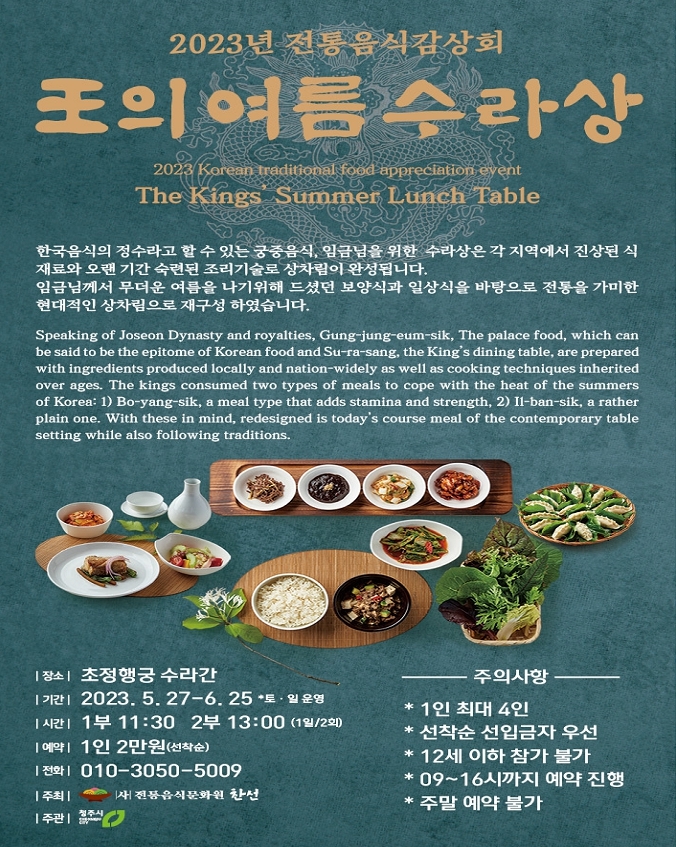 행사를 주최하는 사단법인 '찬선'은 임금이 무더운 여름을 나기 위해 먹는 보양식과 일상식에 무게를 두고 전통을 가미한 현대적 상차림을 선보인다.