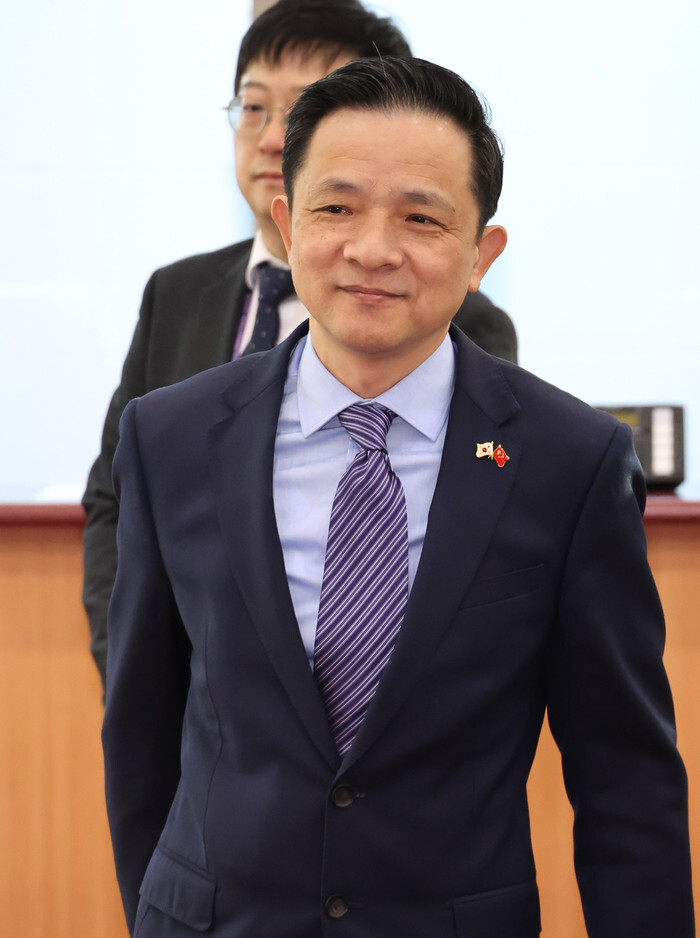 Chinese Ambassador to South Korea Dai Bing enters the foreign ministry building in Seoul on Jan. 24, 2025, to meet with Second Vice Foreign Minister Kang In-sun. (Yonhap)