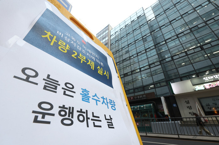 This photo, taken Jan. 21, 2025, shows a sign informing motorists that cars with even-numbered plates are not allowed to be driven for the day, at a parking lot of City Hall in Seoul, as the government took emergency measures against air pollutants in the capital area. (Yonhap)