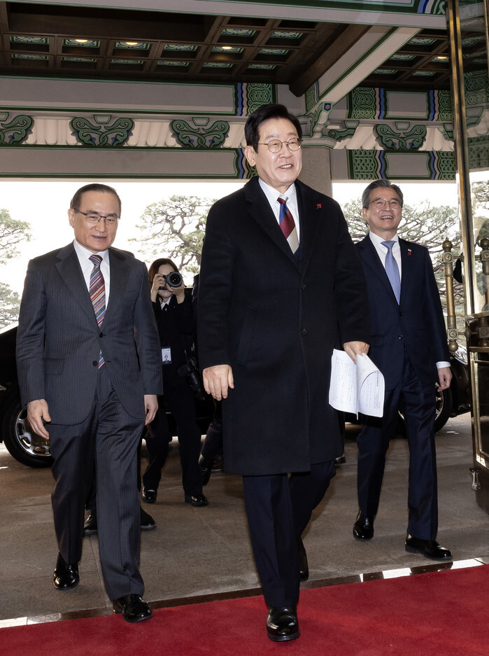 President Lee Jae Myung (front) arrives for work at the presidential office Cheong Wa Dae in Seoul on Dec. 29, 2025, as he begins working at Cheong Wa Dae the same day, with the presidential office officially relocated from the capital's Yongsan Ward after three years and seven months. (Pool photo) (Yonhap)