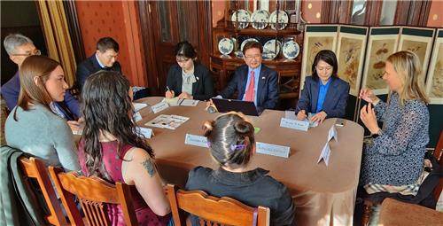 | ▲ K-관광 전략회의 (서울=연합뉴스) = 박보균 문체부 장관이 25일(현지시간) 워싱턴DC 주미 대한제국공사관에서 K-관광 전략회의 참가자들과 대화하고 있다. 2023.4.28 [문화체육관광부 제공. 재판매 및 DB금지] |