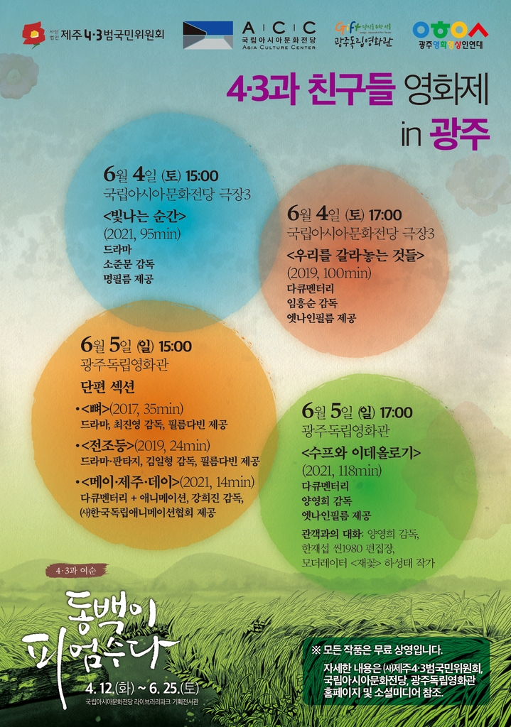 제주4·3범국민위원회는 4∼5일 양일간 광주에 소재한 국립문화아시아전당 및 광주독립영화관에서 '제주4·3과 만난 광주5·18'을 제주로 한 영화제 '4·3과 친구들 영화제 in 광주'를 개최한다고 1일 밝혔다.