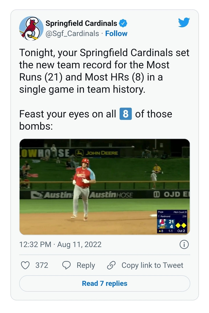 세인트루이스 카디널스 산하 더블A팀인 스프링필드 카디널스 소속 챈들러 레드먼드(25)는 지난 11일(한국시간) 애리조나 다이아몬드백스 산하 더블A팀 애머릴로 소드 푸들스와 경기에 7번 타자 1루수로 선발 출전해 6타수 5안타 4홈런 11타점을 기록했다.