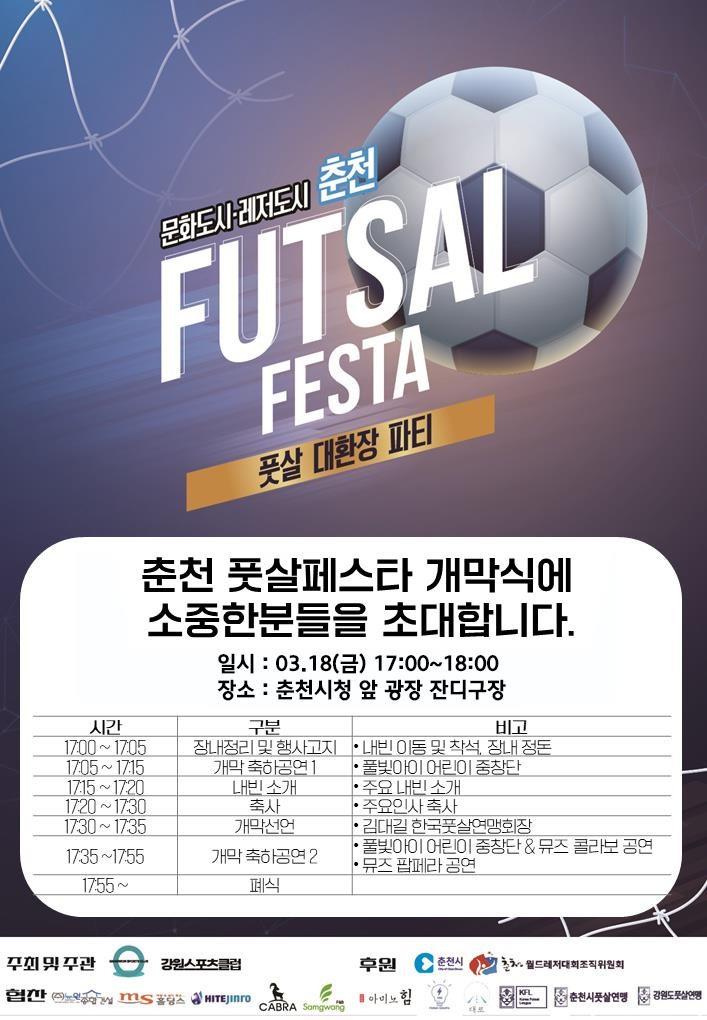 춘천시는 16일부터 20일까지 5일간 춘천시청 앞 광장 잔디구장에서 '풋살페스타'(Futsal Festa)를 연다고 13일 밝혔다.