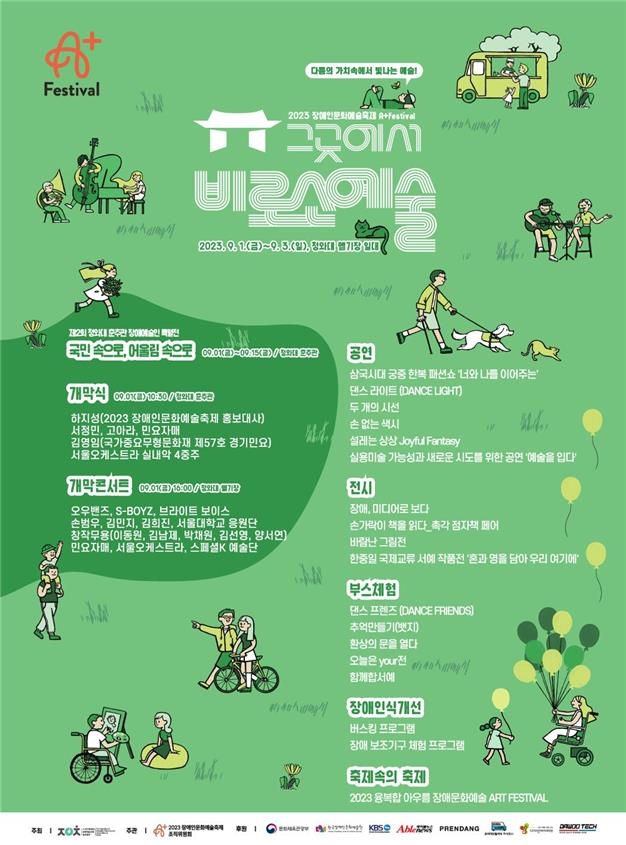 문화체육관광부는 '2023 장애인 문화예술축제 에이플러스 페스티벌'(A+ Festival)이 9월 1~15일 청와대 춘추관과 헬기장 등지에서 열린다고 31일 밝혔다.