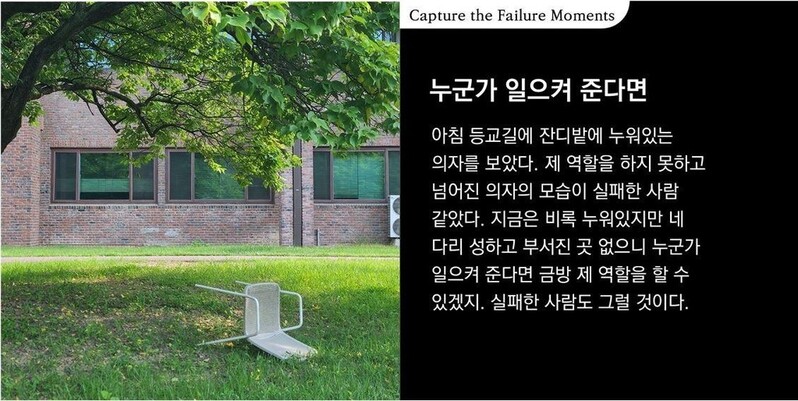 일·성장·생활·회복력 등 크게 네 가지 주제로 학생들이 일상에서 실패를 느낀 순간을 포착한 사진과 당시의 생각을 기록한 메모가 함께 전시된다.